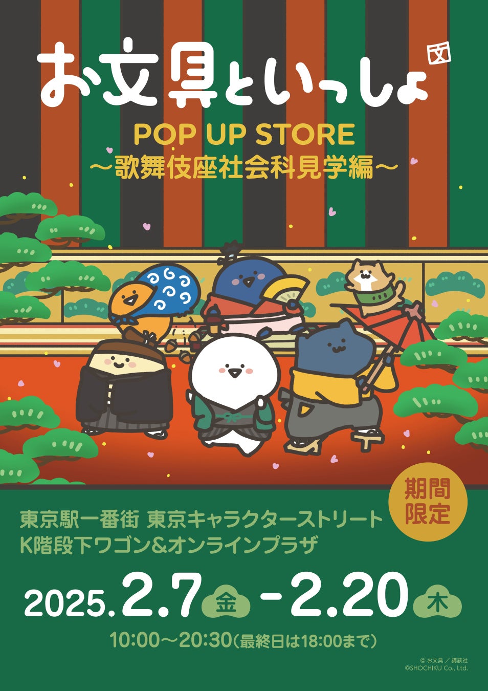 松竹株式会社(東京都中央区、代表取締役社長 髙𣘺 敏弘)事業推進部は、2025年2月7日(金)より、「東京駅一番街 東京キャラクターストリートK階段下ワゴン&オンラインプラザ」及び、「松竹歌舞伎屋本舗GINZA KABUKIZA 木挽町広場店」、通販サイト「松竹歌舞伎屋本舗」にて、“なんだか疲れたこころの中を、ほんのり満たしてくれる”キャラクターシリーズ「お文具といっしょ」と「歌舞伎座」のコラボレーショングッズ「お文具といっしょ~歌舞伎座社会科見学編~」を発売いたします。
