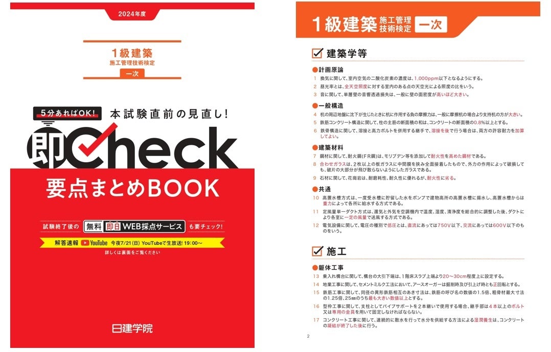 【2024年度 1級建築施工 一次検定】7月12日(金) 12:00~「直前Check」YouTube配信!
