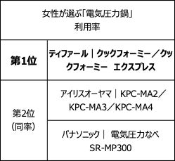 2022年7月~8月に実施した調査において、「ティファール クックフォーミー/クックフォーミー エクスプレス」が利用率4年連続第1位に。「アイリスオーヤマ KPC-MA2/KPC-MA3/KPC-MA4」が総合満足度第1位(同商品は価格満足度、デザイン満足度も受賞)、「パナソニック 電気圧力なべ SR-MP300」がリピート率第1位となりました。