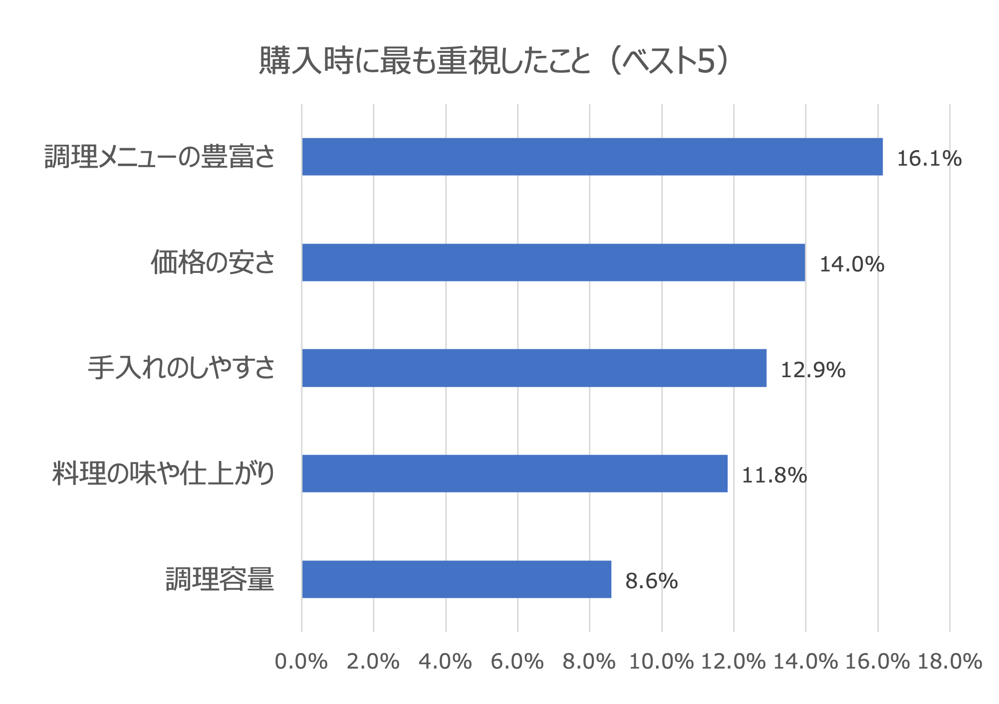 また、購入時に最も重視したことは「調理メニューの豊富さ」「価格の安さ」「手入れのしやすさ」「料理の味や仕上がり」「調理容量」と続きました(上記グラフ)。