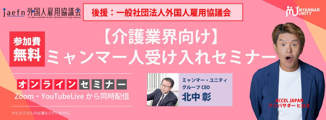 ミャンマー政府認定圧倒的No.1人材送り出し機関「ミャンマー・ユニティ」は、5月29日(水)開催の「【介護業界向け】ミャンマー人受け入れセミナー<後援:一般社団法人外国人雇用協議会>」動画を無料公開!
