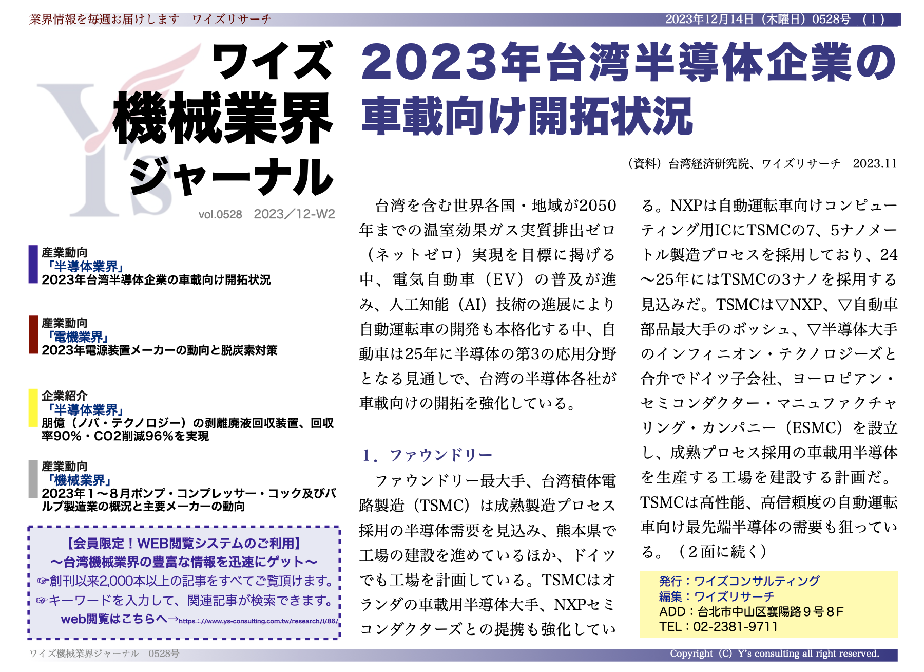 【台湾情報】2023年台湾半導体企業の車載向け開拓状況<ワイズ機械業界ジャーナル2023年12月第2週号発行>