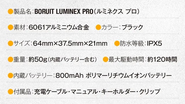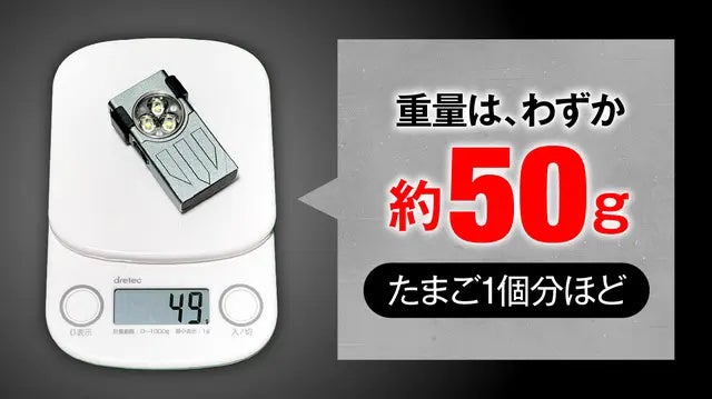 軽量・コンパクトを意識したルミネクスプロは、たまご1個以下・約50gという圧倒的な軽さ!