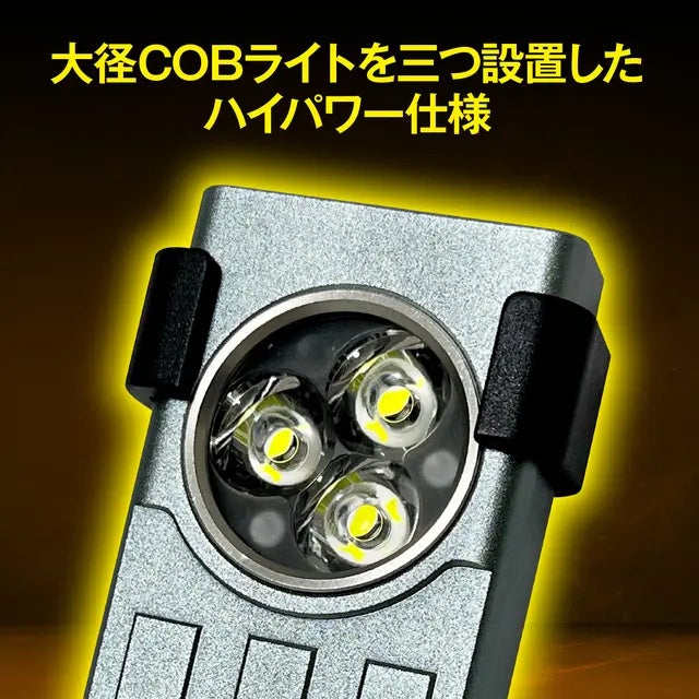 1100ルーメンという眩い明るさの秘密は、正面に設置した大径三連COBライトです。