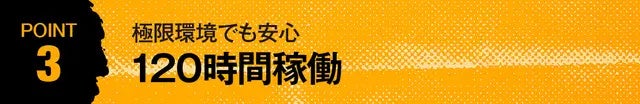 ルミネクスプロは充電式でありながら、120時間という圧倒的な稼働時間を誇ります。