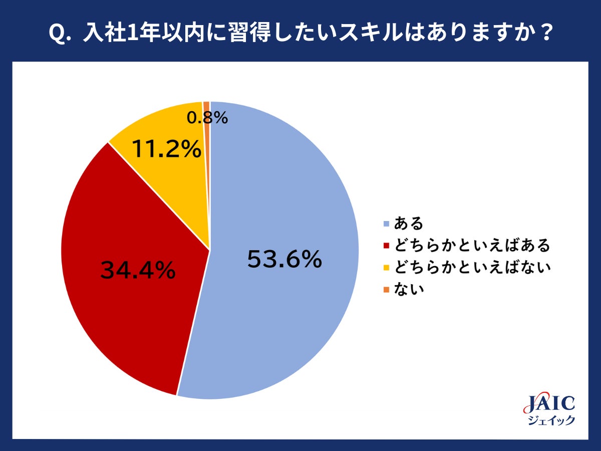 「企業で働き続けるために、入社1年以内に習得したいスキルはありますか?」と質問したところ、「ある」と回答した人が53.6%、「どちらかといえばある」が34.4%、「どちらかといえばない」が11.2%、「ない」が0.8%となり、「ある」「どちらかといえばある」と回答した人は約9割(88%)となりました。