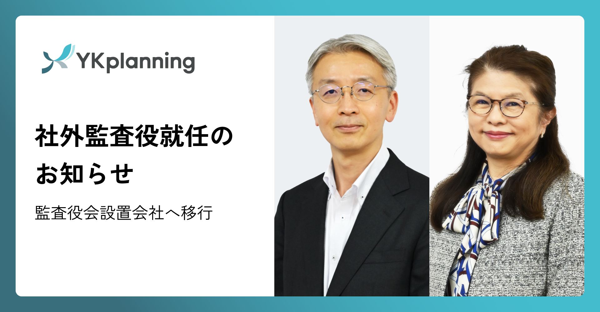 株式会社YKプランニング(本社:山口県防府市、代表取締役社長:岡本辰徳)は、社外監査役として小池裕樹氏・山本純子氏の就任を決議し、監査役会設置会社へ移行することをお知らせします。コーポレート・ガバナンスの一層の強化を目的とした監査体制の整備を進めてまいります。