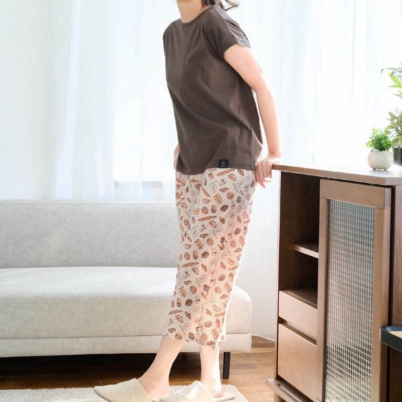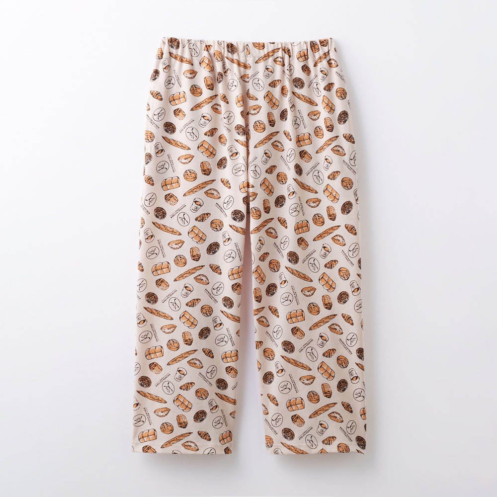 メゾンカイザーの様々なパンのイラストをちりばめた、見ているだけで楽しい気分になる総柄プリントの半袖パジャマ。肌ざわりの良い綿100%の天竺素材を使用しており、心地よい眠りをサポートします。ゆったりとしたサイズ感で、おうちでのリラックスウェアとしても最適です。