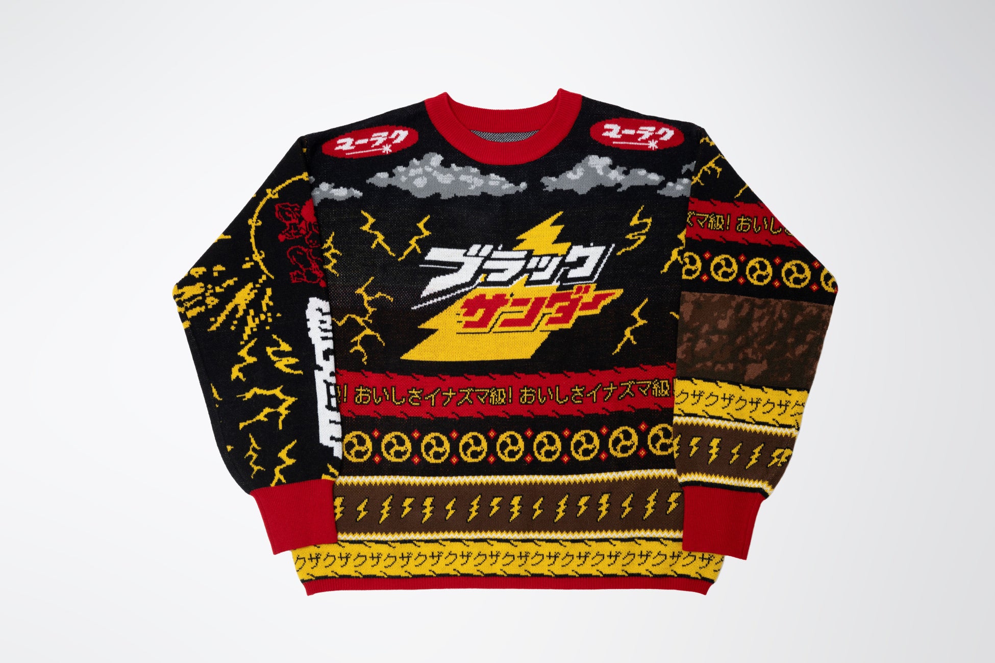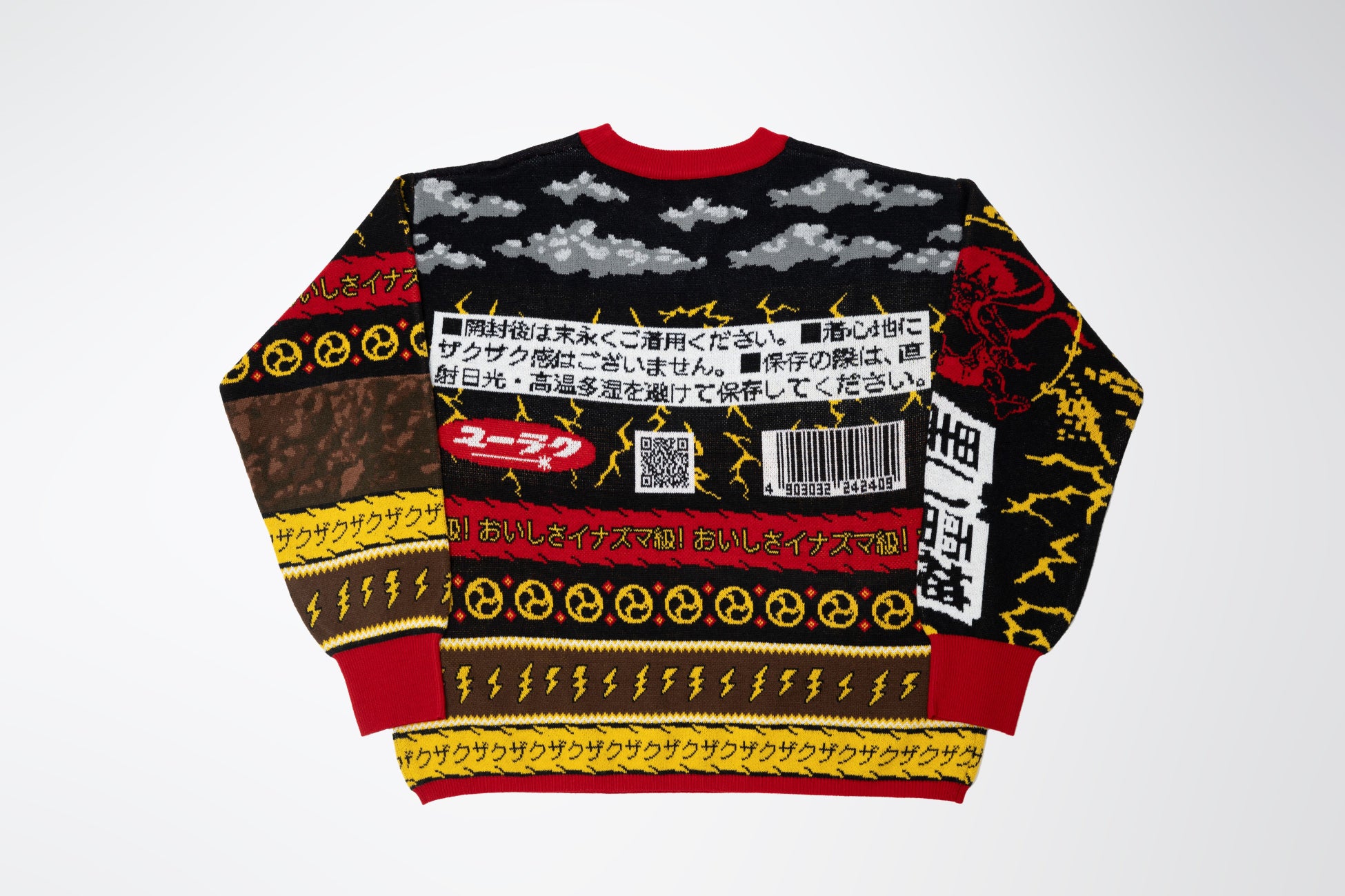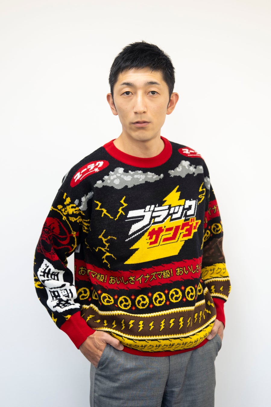 ブラックサンダーの要素をユニークにちりばめたオリジナルのセーターです。ブラックサンダーのロゴを中心に、キャッチコピー「おいしさイナズマ級!」や食感の「ザクザク」文字があしらわれています。袖にはブラックサンダーのお菓子を再現した部分や、雷神様が描かれたりとやりたい放題です。さらに裏面にはセーターの取り扱いをパッケージの裏面風に表記したユーモアあふれるデザインです。