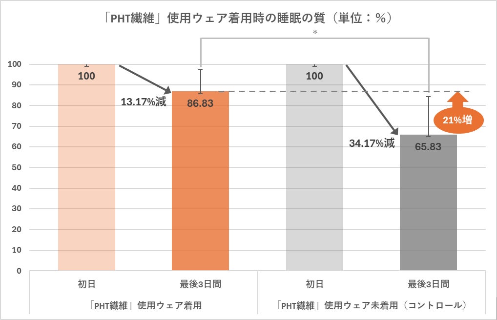 初日の睡眠の質を100%とした時、「PHT繊維」を使用していないウェアを着用したグループでは、最後の3日間の睡眠の質が65.83%まで減少したのに対し、「PHT繊維」を使用したウェアを着用したグループでは、86.83%の減少に留まり、睡眠の質低下を防ぐ効果が見られました。