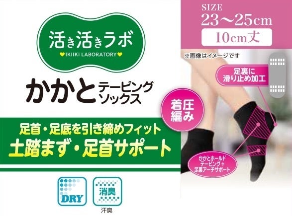 かかと周りのテーピングが足首を引き締め、靴下内のズレを軽減し、歩きやすくします。