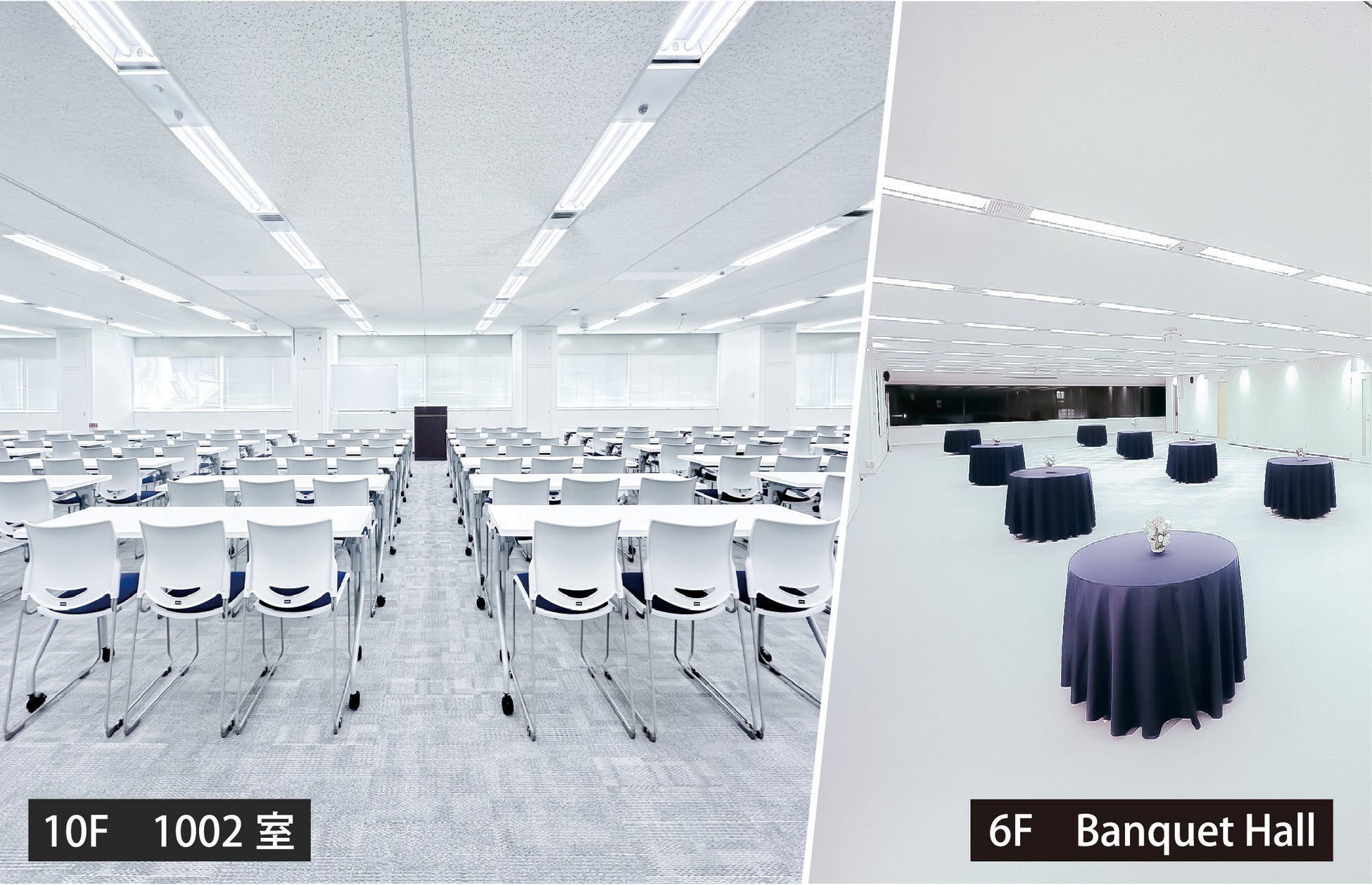 総床面積は約1,450坪(4,800㎡)、6席~380席の大小様々な会議室・ホール(全66室)を揃えています。大規模な懇親会や宴会などのご利用ニーズ増加に伴い、6階にはワンフロアでご利用いただけるバンケットホール(632㎡)をご用意しました。懇親会や式典をはじめとした各種イベント、企業研修やセミナー、会社説明会、試験や検定会場、商談会場など、さまざまな用途に応じたサービスをご提供します。