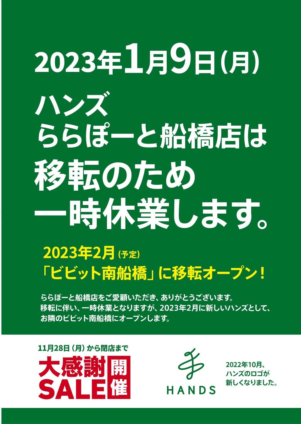 株式会社ハンズ(本社:東京都新宿区、代表取締役社長:桜井 悟)は、2023年1月9日(月)をもってハンズららぽーと船橋店の営業を終了、同年2月に隣接する施設、ビビット南船橋にてリニューアルオープンいたします。