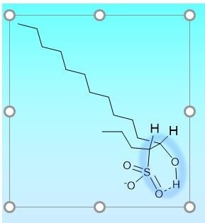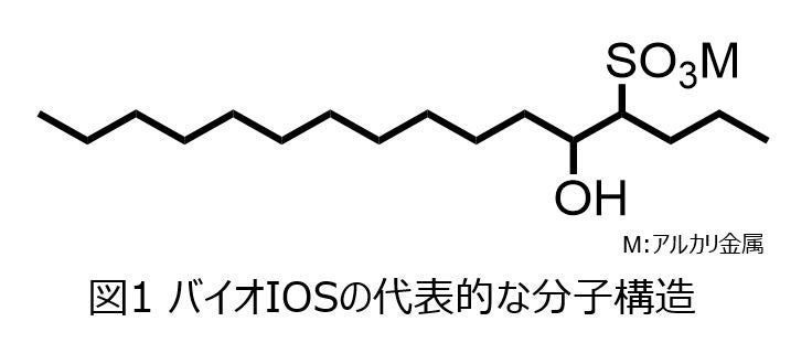 人々の清潔な生活を支えるためには、洗浄剤の主成分である界面活性剤を、将来にわたって使い続けられるよう確保する必要があります。界面活性剤は油になじみやすい親油基(アルキル鎖)と水になじみやすい親水基を併せ持つ分子種ですが、現在主に使用されている界面活性剤は、アルキル鎖の炭素鎖長が12~14(C12~C14)で、総植物油脂原料のうちわずか5%の原料から作られており、将来的な供給が課題となっています。花王は、2019年に長いアルキル鎖(C16~C18)を持ち、その中間部に親水基を有する界面活性剤「バイオIOS」(図1)を開発しました※2。バイオIOSは、パーム油の中でも食用と競合しにくい、用途が限られている固体性油脂を原料として活用できる点においてサステナブルといえます。