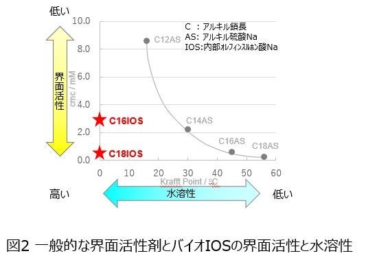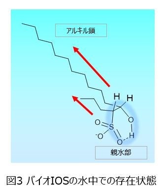 ■「バイオIOS」の水中での存在状態から、高い界面活性と水溶性が両立する理由を解明一般的に、界面活性剤の アルキル鎖長を長くすると界面活性は高まるものの、水溶性は低下します。逆にアルキル鎖長を短くすると水溶性は向上するものの、界面活性は低下します。このように界面活性と水溶性を高いレベルで両立させることはこれまで難しいと考えられてきました。しかしながらバイオIOSは、長いアルキル鎖の持つ高い界面活性を維持しながらも、高い水溶性を併せ持ちます(図2)。