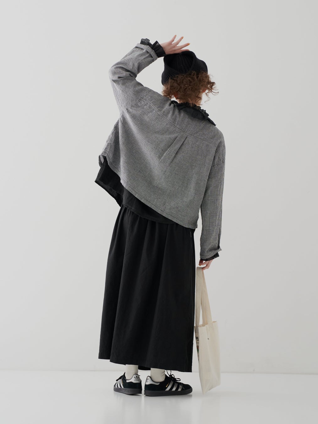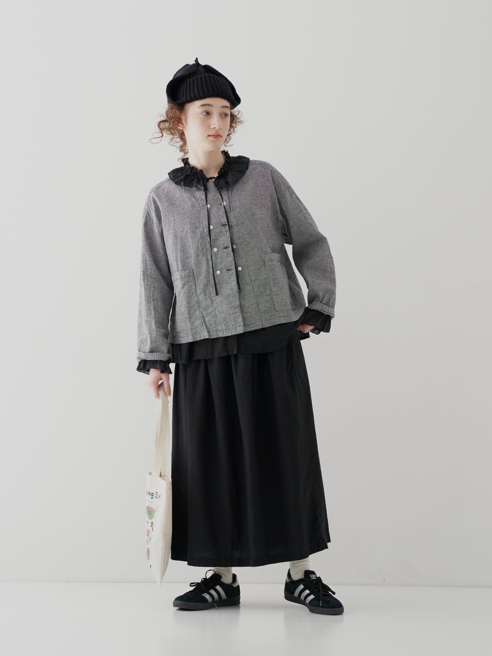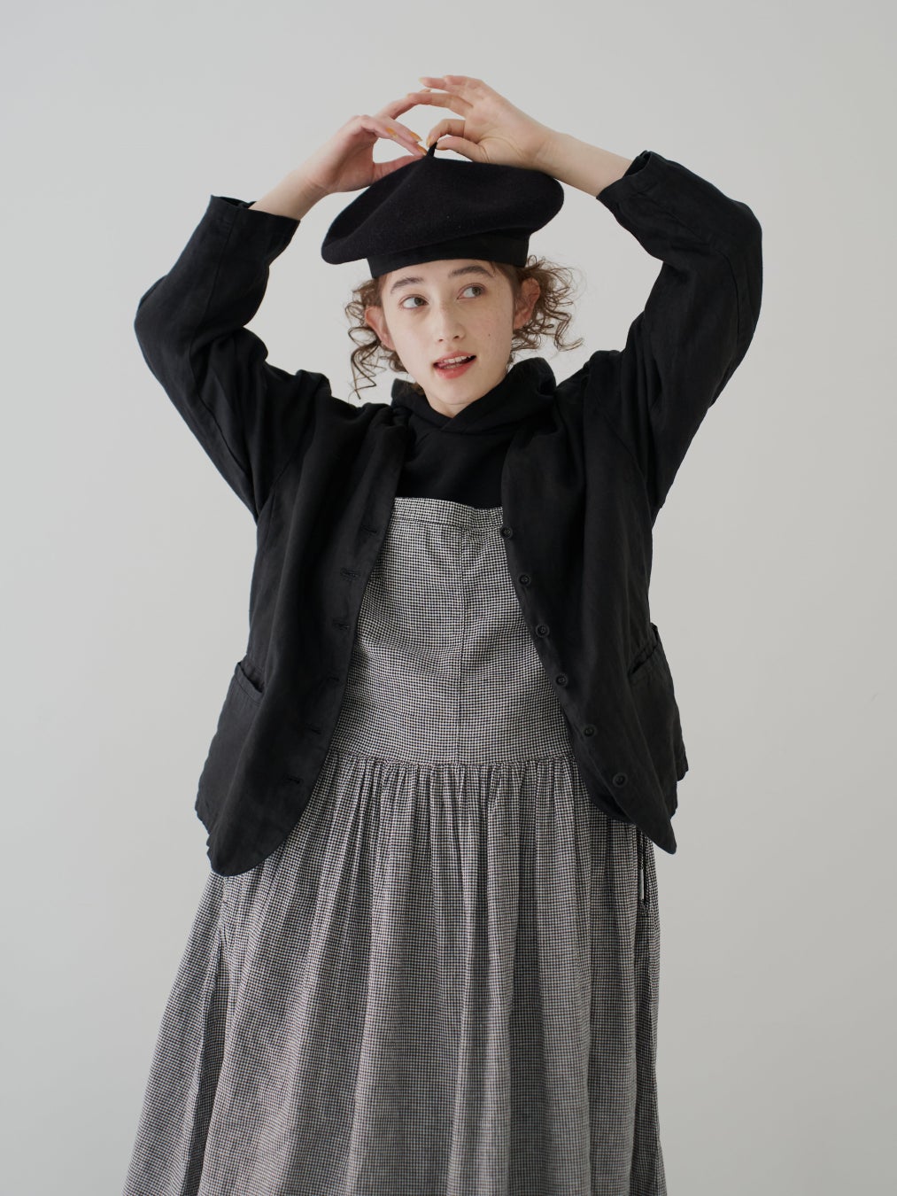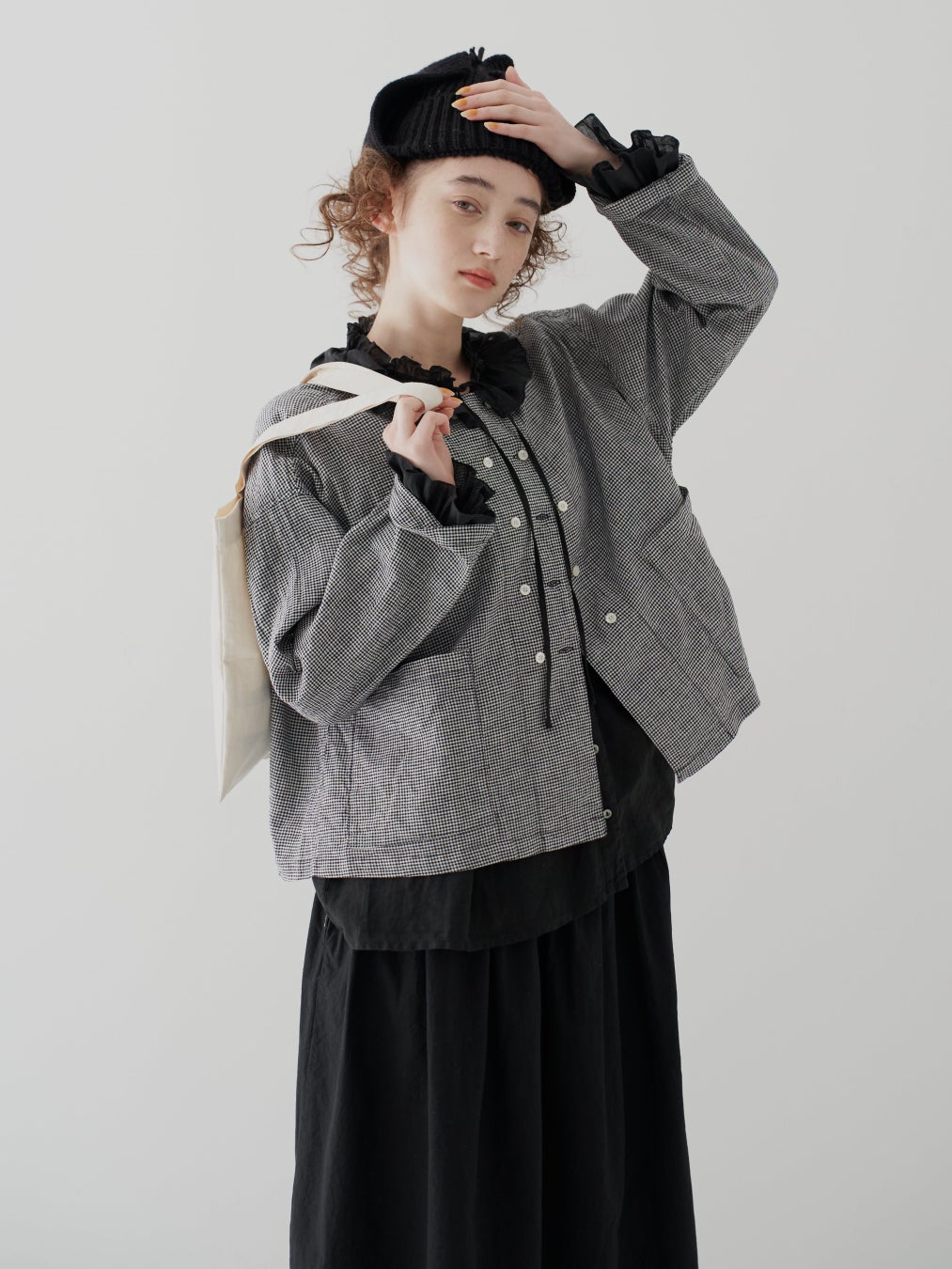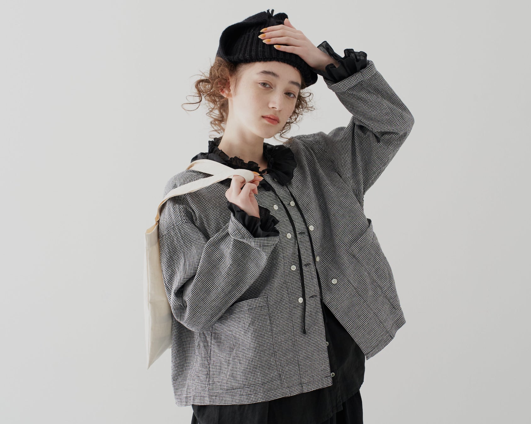 セミダブルのフロントや、パッチポケットなどジャケットディテールを取り入れつつ、素材の軽さを活かしコンパクトな丈感や、シャツ釦使いで軽やかに仕立てたシャツジャケット。同シリーズのエプロンドレスやパンツとのセットアップスタイルもおすすめです。