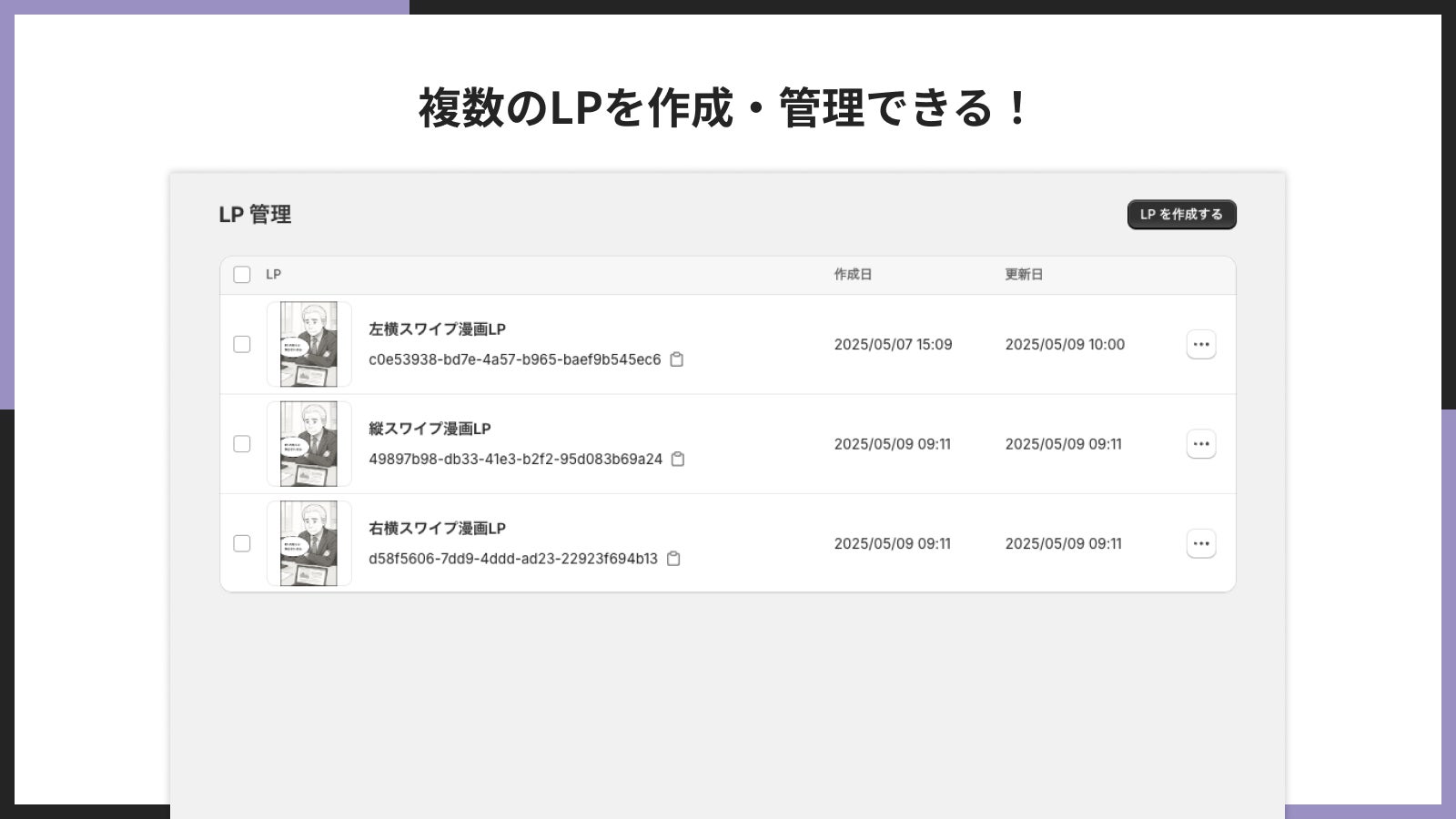キャンペーンごとや商品カテゴリーごとに、いくつでも漫画LPを作成・運用できます。複数のLPを一覧で確認できます。既存のLPを複製して新しいバージョンを作成する機能もあり、効率的な運用が可能です。