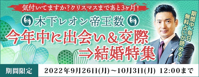 テレシスネットワーク株式会社(本社:東京都港区、代表取締役:鷹石惠充 https://www.telsys.co.jp/)は、2022年9月26日(月)より、月額公式サイト『木下レオン◆帝王数』にて、『木下レオン帝王数 「今年中に出会い&交際⇒結婚特集」』を公開いたします。