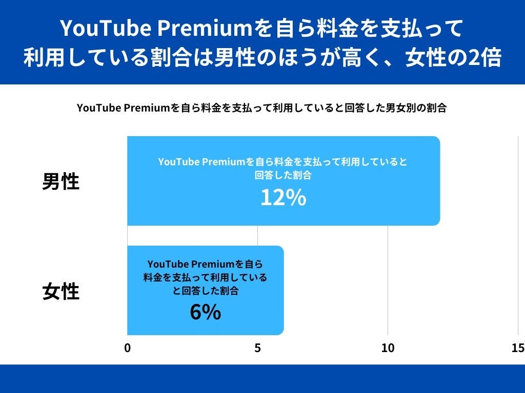 YouTube Premiumを自ら料金を支払って利用していると回答した割合を男女別でみてみますと、男性が12%、女性が6%という結果になりました。