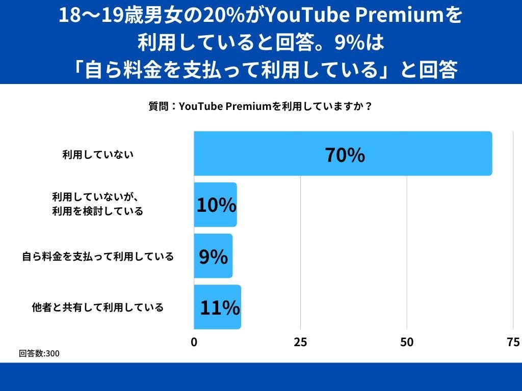 18~19歳の男女を対象とした「YouTube Premiumを利用していますか?」というアンケートで最も多かった回答は「利用していない」で70%でした。
