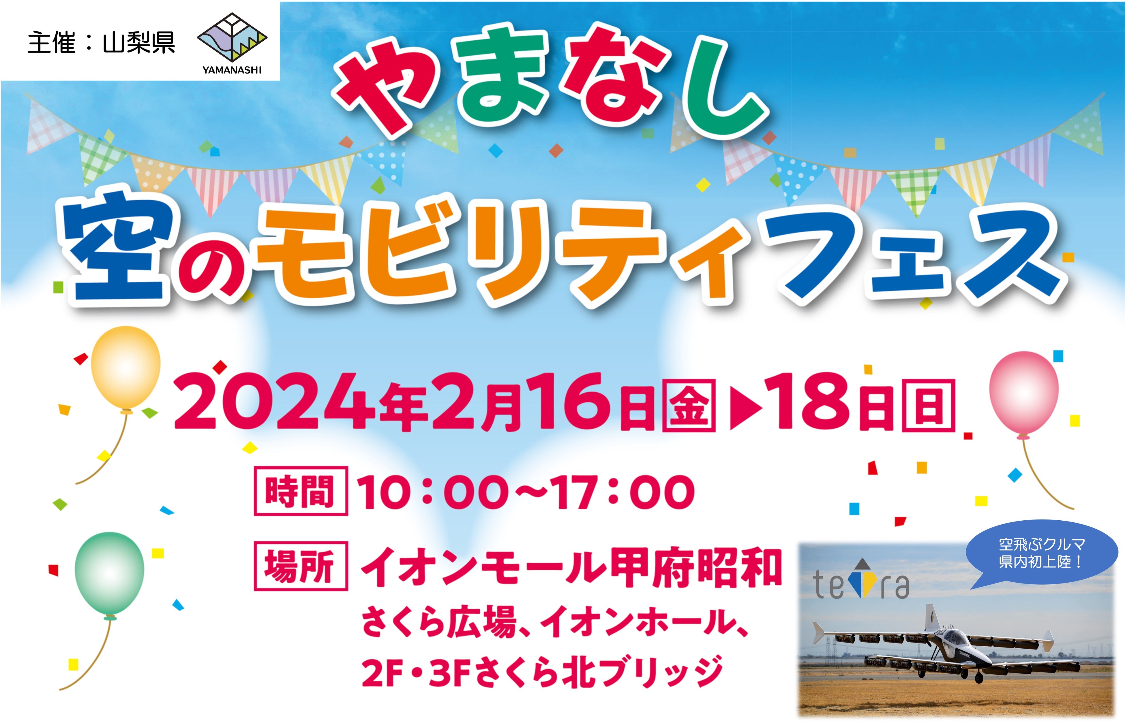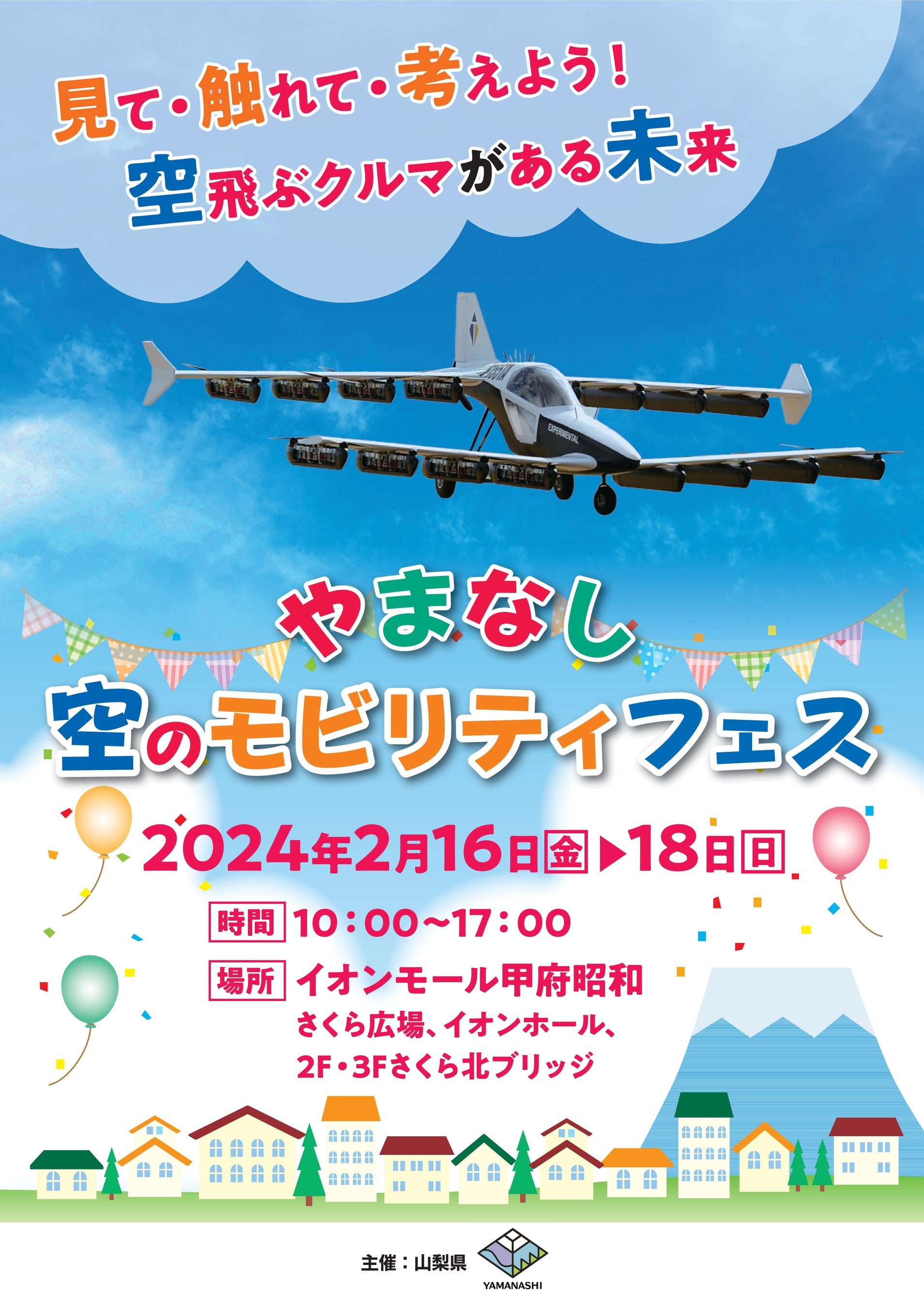 このたび、100年に一度とも言われる「空の移動革命」に向けて、県民の皆様に「空飛ぶクルマ」や「ドローン」など次世代空モビリティを身近に体感していただき、空の活用可能性について幅広く考えていただく機会として、「やまなし空のモビリティフェス」を開催いたします。