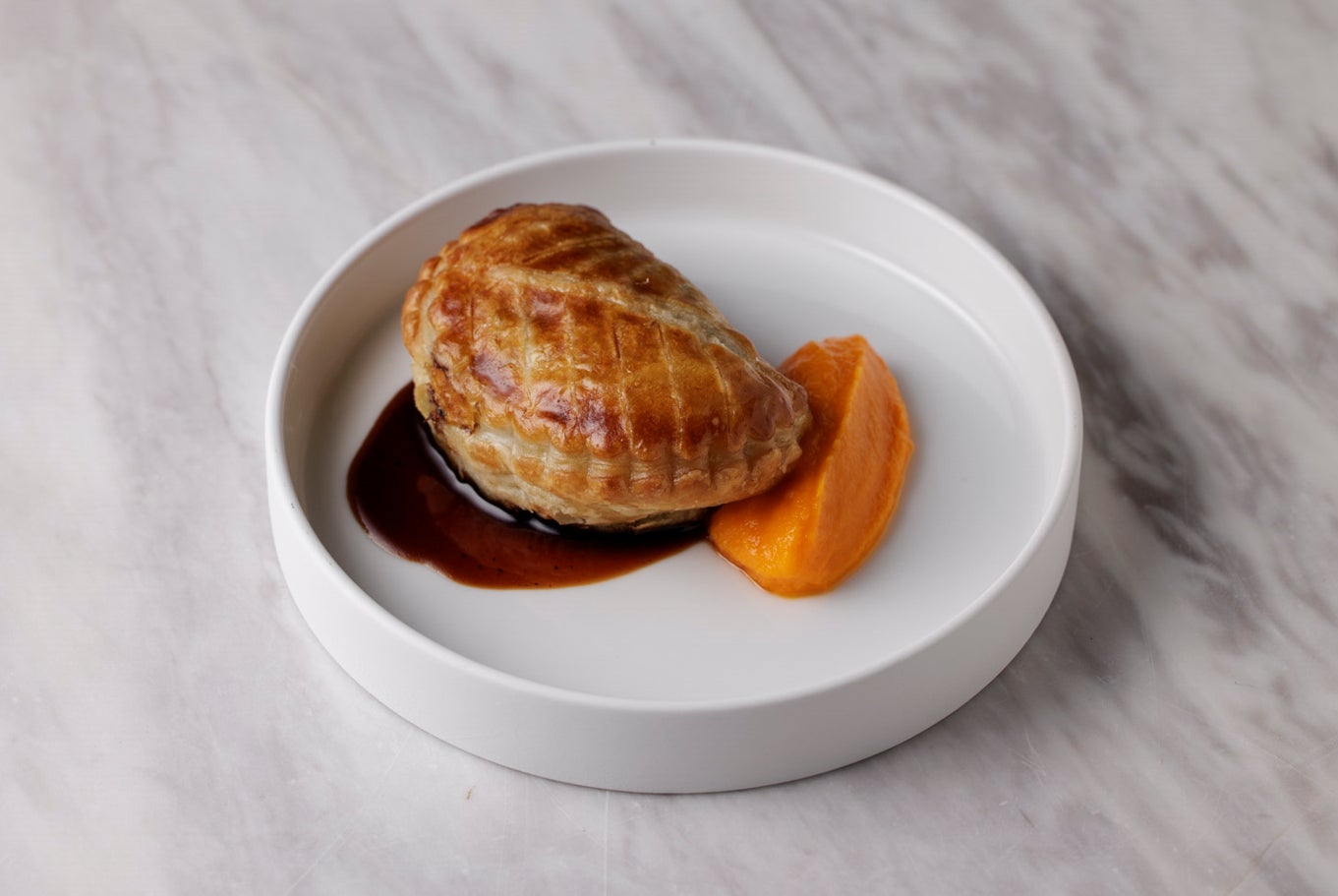 フランスのフェスティブシーズンに欠かせないパイ料理をご用意いたしました。サクサクのパイと牛頬肉の一体感を味わって頂けるよう、出来たてそのままに暖かな状態でお持ちいたします。お肉料理と相性抜群のキャロットのピューレと一緒にお召し上がりください。