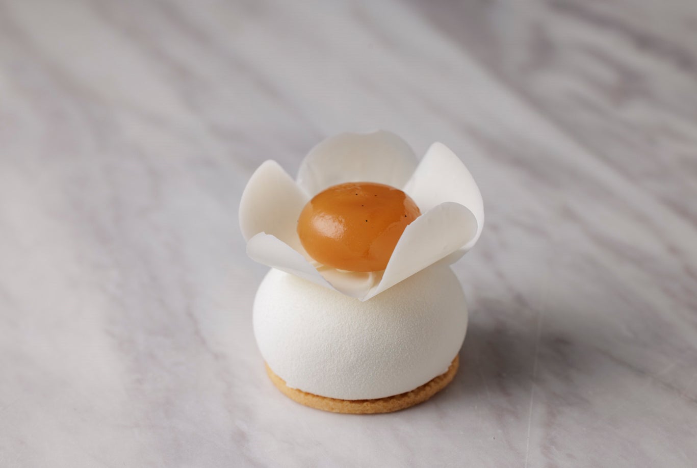 お花の蕾部分は紅玉リンゴのタタン、下層部は濃厚リッチなシナモンクリームと、程よい酸味の青リンゴのムースをホワイトチョコレートで包み多層的な味わいを一口でお愉しみいただけます。シナモンやスターアニス等スパイスを巧みに使いこなす、フレンチのパティシエならではのクォリティ高いスイーツをこの機会にどうぞ。