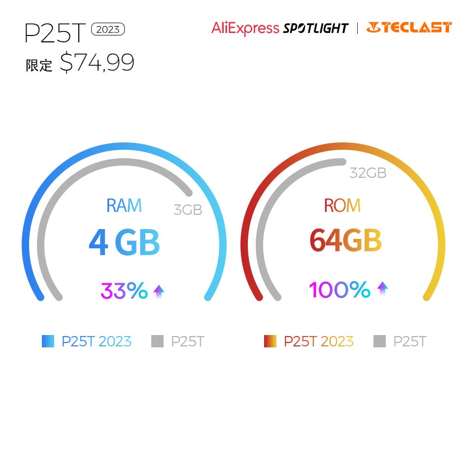 スタイリッシュなシルバーグレーとスカイブルーの2つデザイン備えるTeclast「P25T」グレードアップ完成!Mail-G25 GPUに更新され、RAMは3GBから4GBまで拡張しております。下記の記事で最も詳しい2023年新バージョンの魅力点をご紹介させていただきます。