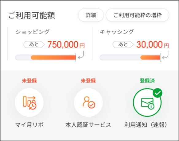 クレジットカードのご利用可能額をグラフで表示し、本人認証サービス(3Dセキュア)などの各種サービスの登録状況をアイコンにすることで分かりやすくしました。