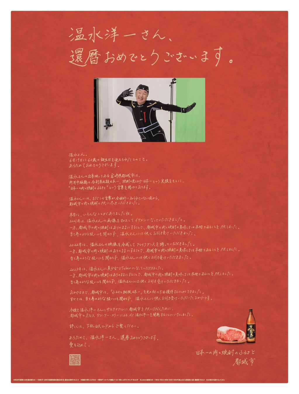 本市出身の俳優で、都城市の肉と焼酎のPRに長年ご尽力いただいている温水洋一氏の還暦祝いを切り口として、これまでの温水氏との取り組みをユーモアを交えて振り返りつつ、肉と焼酎をPRするものです。