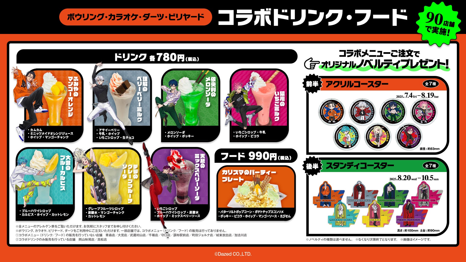 全国のROUND1内のボウリング・カラオケ・ダーツ・ビリヤードの90店舗にてコラボメニューを販売いたします。対象メニューをご注文いただいたお客様には、オリジナルノベルティをプレゼントいたします。