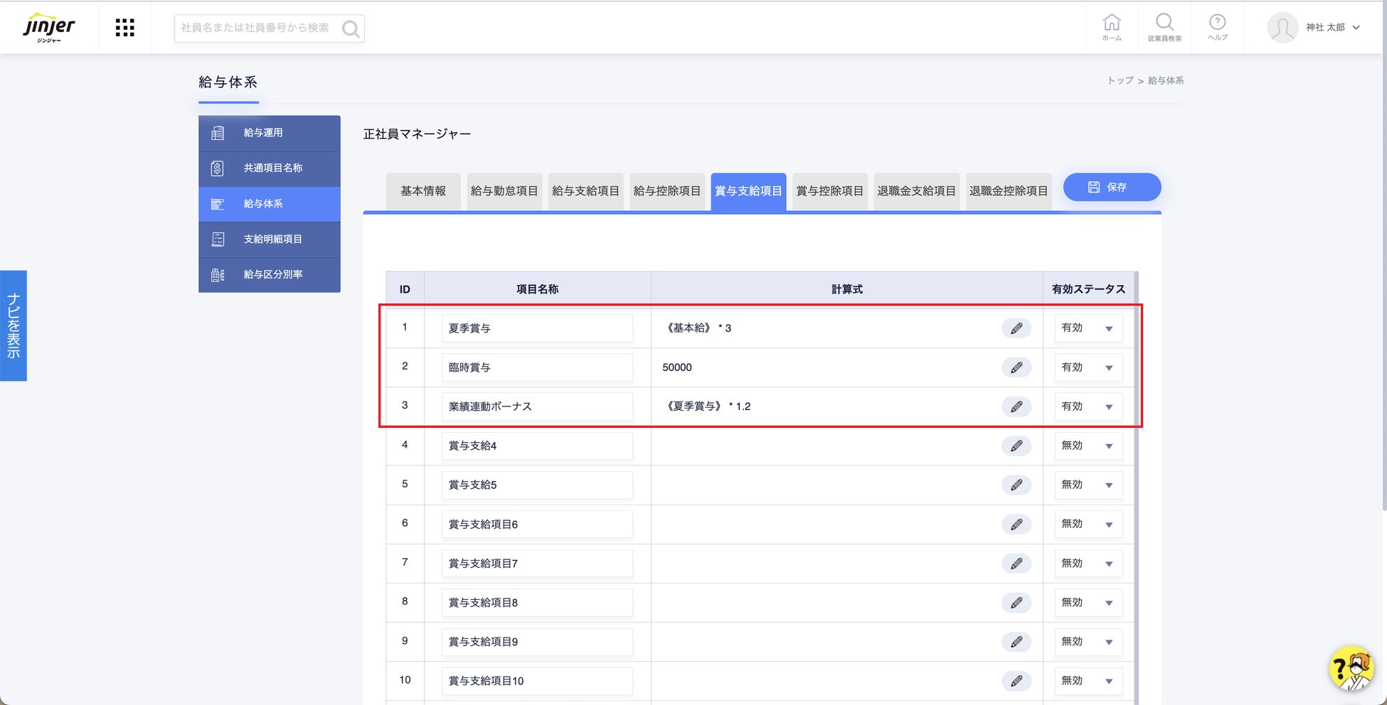 「ジンジャー給与」では、雇用区分や職種、役職等によって給与体系が異なる場合でも、複数の給与体系を登録することができるため、賞与の計算式においても、給与体系ごとに異なる計算式を組むことができます。