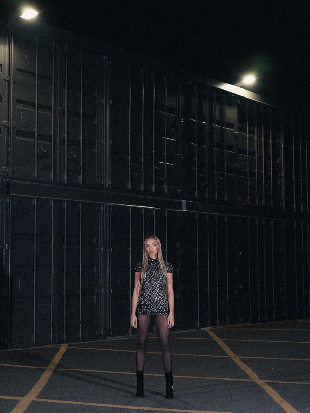 2025年春夏プレコレクションから、クリスタルドットの刺繍が施されたミニドレスとブラックナイロン製バーディーブーツを着用しています。