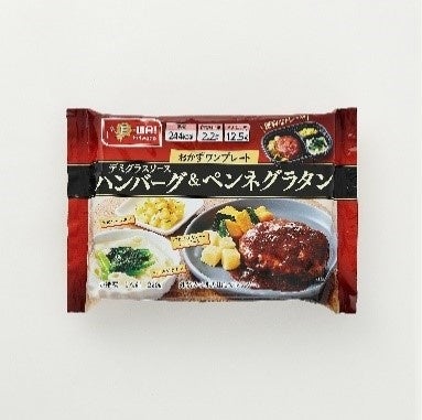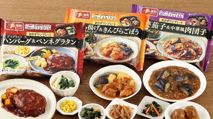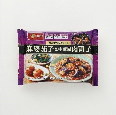 E-WA! おかずワンプレート 全3種は、大満足のメインにふたつの副菜のセットで、野菜もふんだんに使用しています。栄養バランスにもこだわり、すべて熱量300kcal以下、食塩2.3g以下です。【洋風】はふっくらジューシーなデミグラスハンバーグにペンネグラタンとコーンソテーのセット、【和風】はおかずの定番、鶏から揚げの野菜あんかけときんぴらとほうれん草の副菜をセットにしました。そして【中華風】はごろっと大きな茄子の麻婆茄子と、甘辛だれが利いた中華風肉団子で食べ応え抜群です。トレイ入りなので、そのままレンジで温めるだけ!冷凍庫にストックしておけば、忙しい日にとっても便利です。ぜひ一度お試しください!