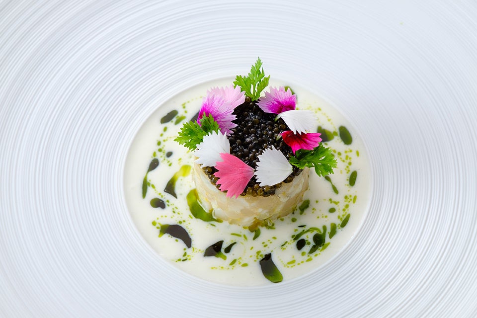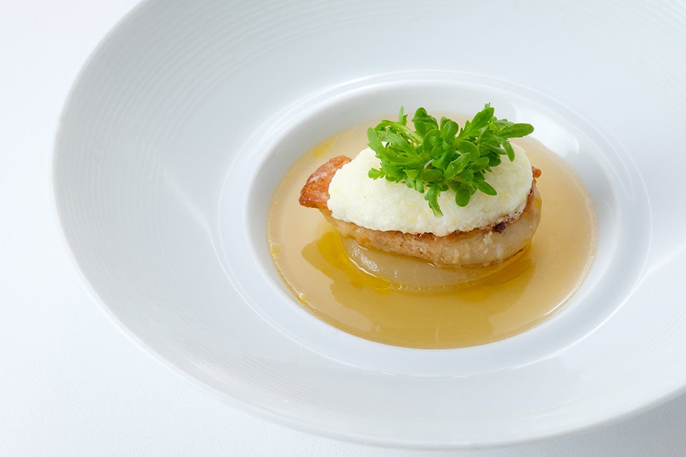 オシェトラキャビアを主役に、上質な素材が響き合う一品。福岡県・糸島産の真鯛と帆立貝を、福岡県産の柑橘 "璃の香(りのか)"の香りを纏わせマリネし、シンプルなタルタルに仕立てました。合わせたカリフラワーのクリームが海の滋味にやさしい調和をもたらします。アネットオイルが香る軽やかなスープ仕立てのソースが、味わいに爽やかなアクセントを添えます。