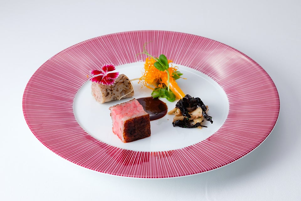 きめ細やかな霜降りの鹿児島県産黒毛和牛を丁寧にポワレし、まろやかな旨味と深いコクを最大限に引き出しました。タイム香る牛肉を白石蓮根で包み込んだファルシや、糸島産姫人参と季節野菜のグラッセ、黒ラッパ茸を合わせた旨味溢れるフリカッセなど、九州産食材の個性が重なり合う一皿です。クラシックな赤ワインソースとともにご堪能ください。