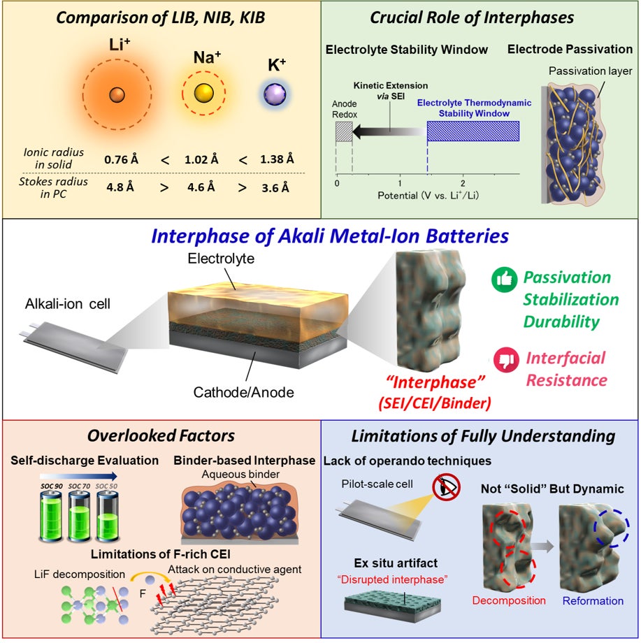 本総説論文では、リチウム・ナトリウム・カリウムイオン電池の界面層を、それぞれの物理化学的性質に基づいて系統的に比較しつつ、主に①SEIおよびCEIが本質的に動的かつ準安定的な構造をとること、②高電圧化に伴うフッ素系CEIの限界、③バインダーが界面形成や安定性に与える影響、④CEIの機能性や形成メカニズムが一般化されていること、⑤界面層の安定性や不完全な不動態化が電池の自己放電に及ぼす影響について、体系的に再定義を行っています。