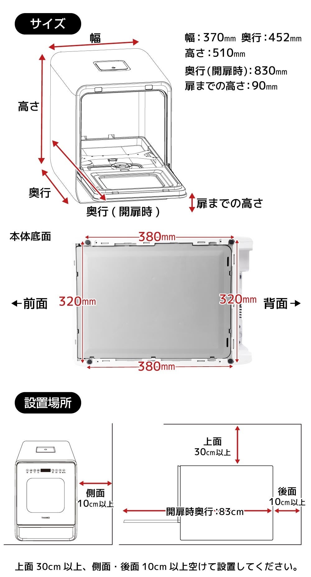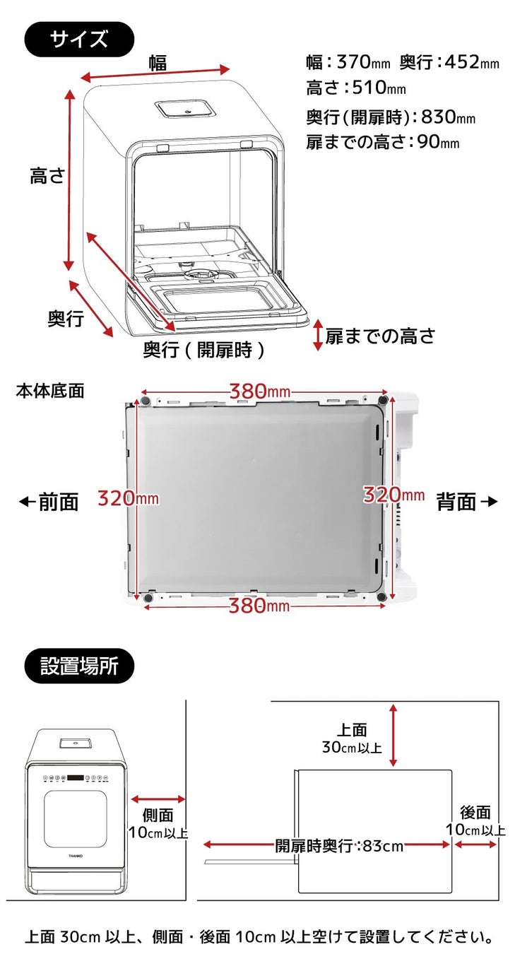 幅370×奥行510×高さ452mmの幅が狭いタイプなので、幅広タイプの食洗機だと置くスペースが限られる状況でも設置が可能。