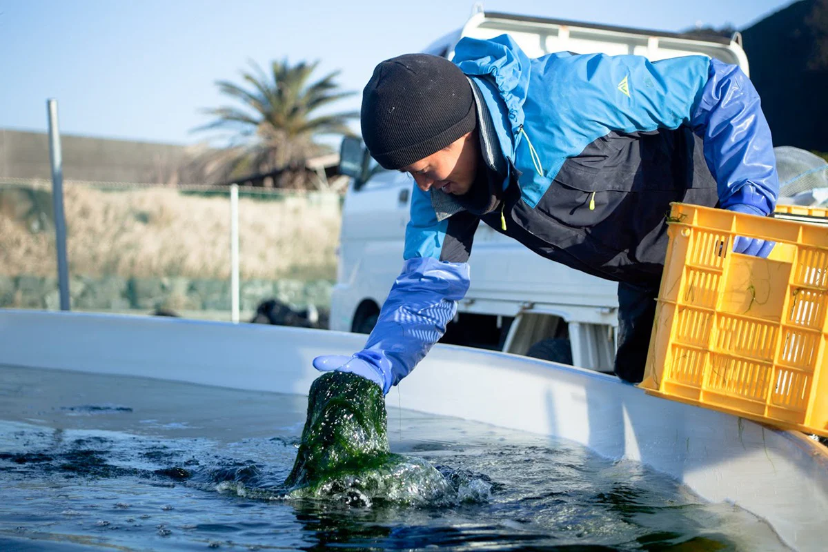 2016年に世界で初めて地下海水を用いた青のりの陸上栽培をスタートしました。現在は地域の海域に合わせた海藻の海面栽培にも取り組みながら、温暖化の影響で減少した海藻の回復を目指しています。育てた海藻を社会でおいしく食べてもらう循環をつくることで、海の生態系を守ることに繋げています。「すじ青のり」や「若ひじき」などの製品を全国で展開しています。
