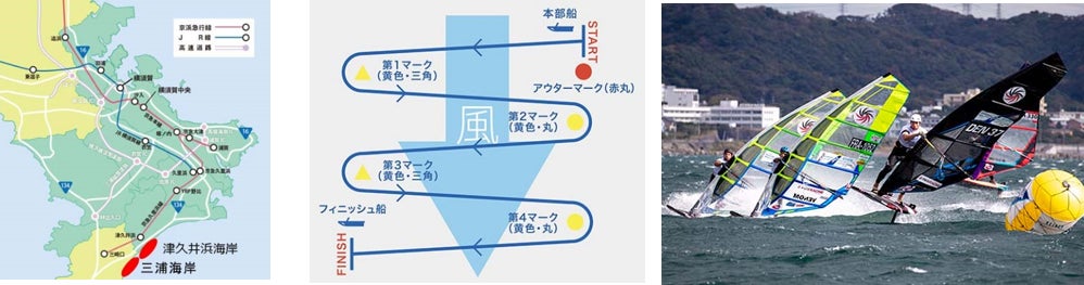 レースはウインドサーフィンが最もスピードを得られる風上から風下へのジグザグコースに複数のマークブイを設置して走る「スラローム」で競います。男子の最速記録は時速約65キロにもおよび、レースの舞台となる津久井浜海岸沖は、この「スラローム」に適した風“サイドショア(海の真横から風が吹く)”が吹く日本屈指のゲレンデとして知られています。