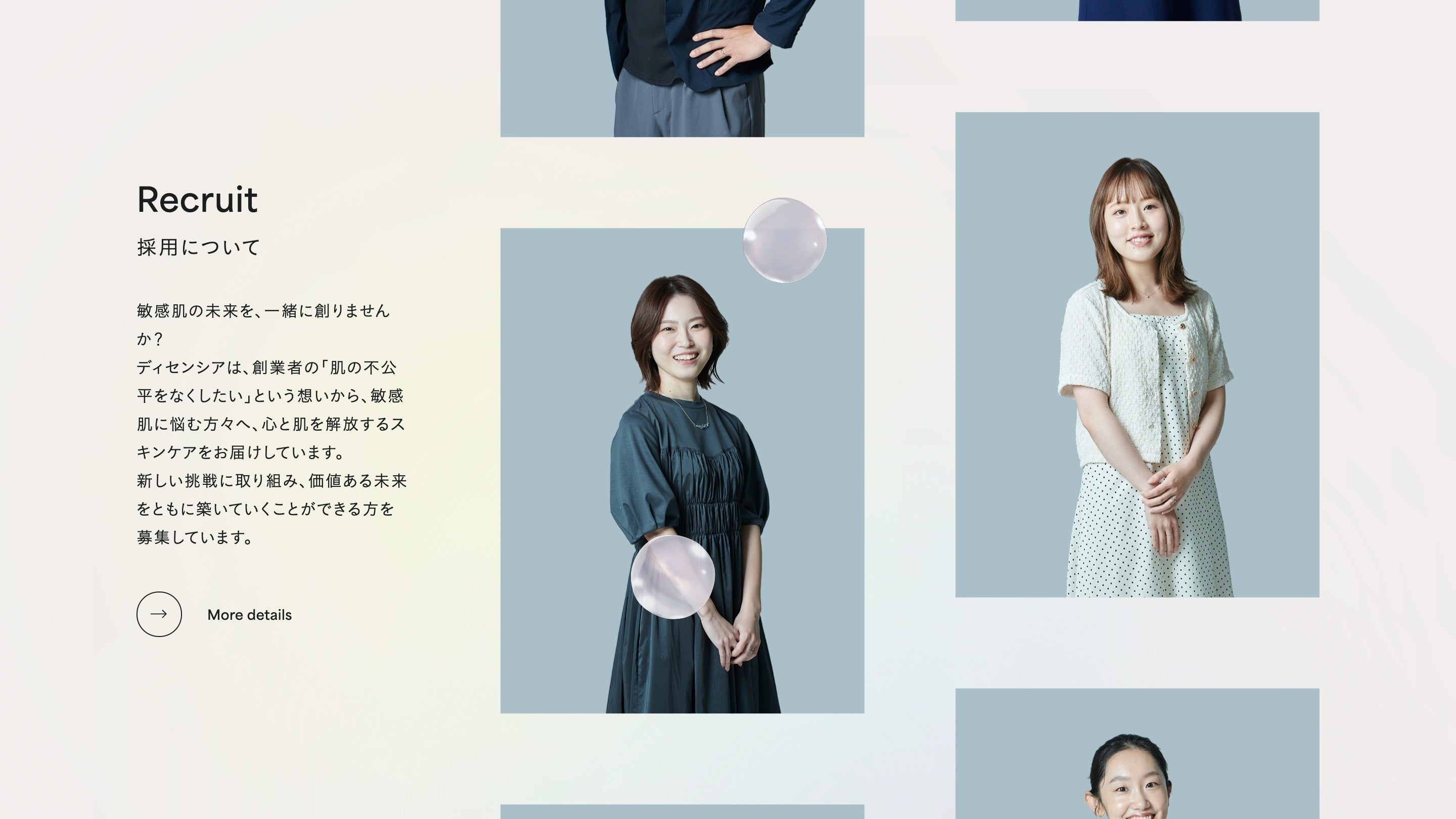 共に未来を創る仲間を募集する採用ページでは、ディセンシアで働く社員のインタビューを新たに掲載し、企業文化をリアルに伝えるコンテンツをご提供しています。ディセンシアでの働き方やキャリアについて、生の声を通じて知り、「ディセンシアで働く」ことをイメージいただきやすくしました。