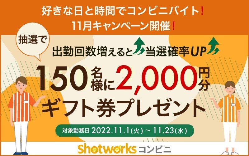 当社連結子会社である株式会社ツナググループHC(本社:東京都千代田区、代表取締役社長:上林 時久)が運営するコンビニバイト専門のマッチングサービス『ショットワークスコンビニ(https://convini.shotworks.jp/?npr=1)』が、2022年11月1日(火)~2022年11月23日(水)の期間中にショットワークスコンビニを通じ応募・出勤された方を対象とした抽選キャンペーンを実施いたしますのでお知らせいたします。