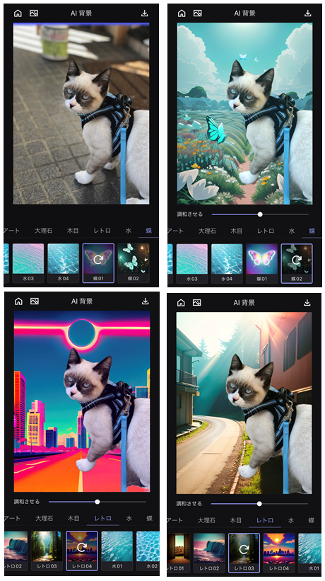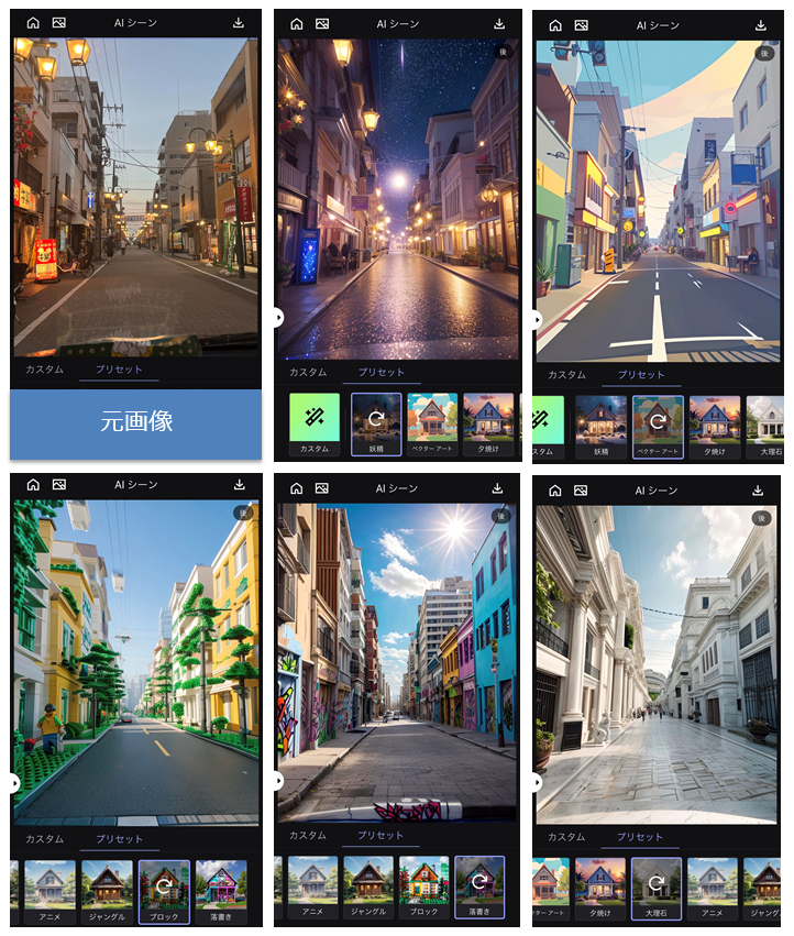 ・AI技術により、風景の建物などを残したまま、季節や周りの環境を自由に変えることができます。