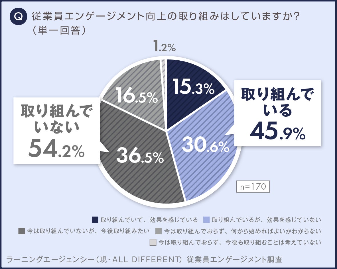 一方で、当社の調査*では、半数以上の企業がエンゲージメント向上に取り組めていないという実態も明らかになりました。