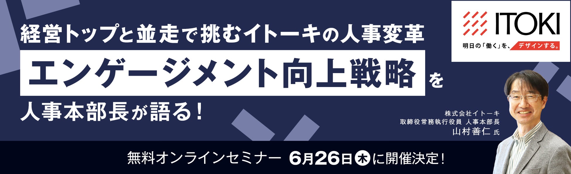 そこで今回のセミナーでは、従業員エンゲージメント向上を実現し、離職率や経営課題を改善していきたい企業に向けて、株式会社イトーキより、取締役常務執行役員 人事本部長 山村善仁氏に「エンゲージメント向上戦略の成功事例」についてお話しいただきます。