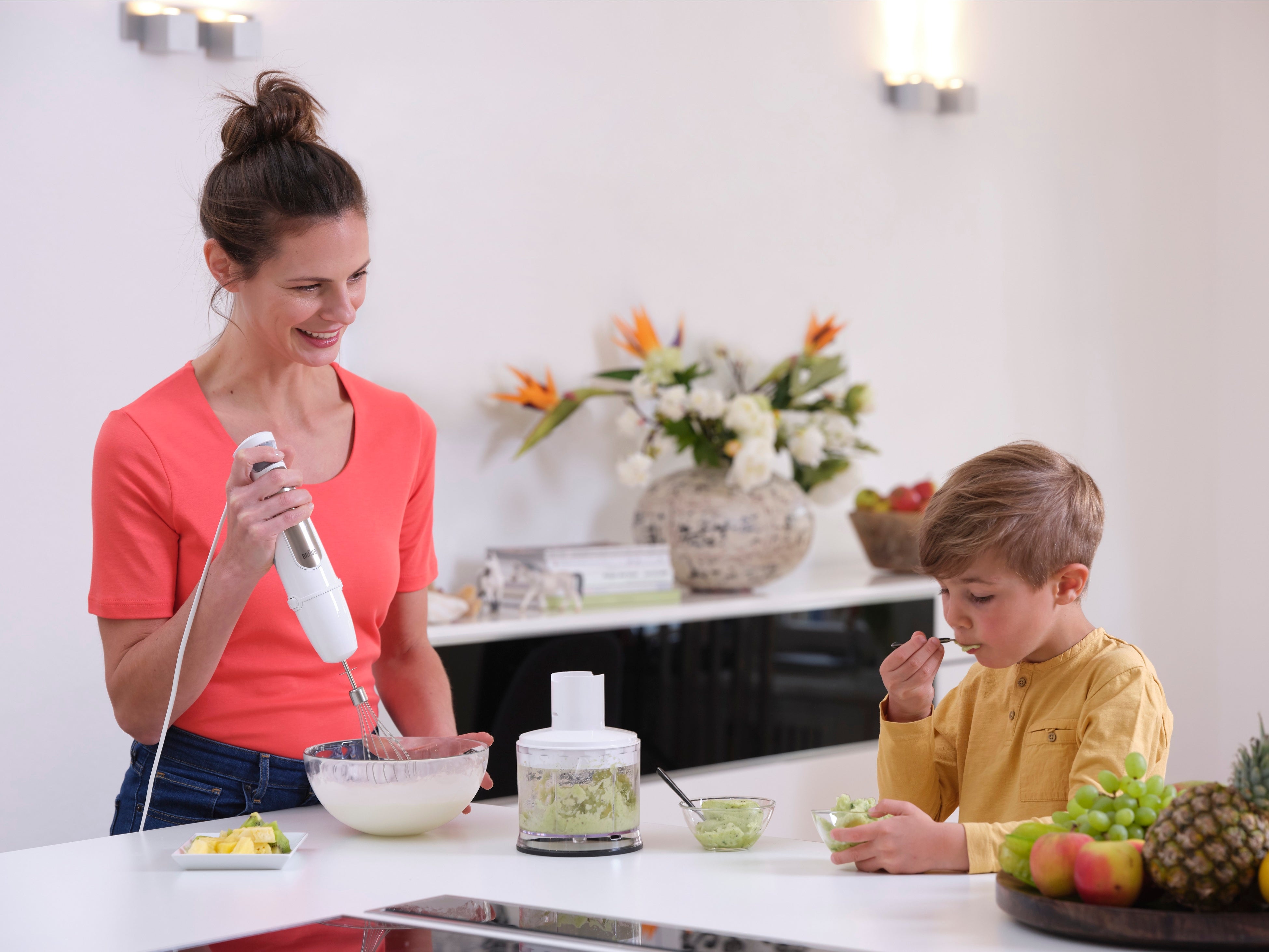 ハンドブレンダーの命ともいえるモーターは、ブラウンが独自に開発したドイツ品質のハイパワー設計。また、人間工学に基づいたデザインは、すっと手になじむだけでなく、しっかり持てて滑りにくいので、ハイパワーの使用時でも手軽に扱えます。
