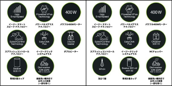 今回発売する製品は、ハンドブレンダーの基本機能である「つぶす」「混ぜる」に加え、お菓子づくりに便利な新アタッチメントの「ダブルビーター」(MQ7005BWHに付属)もしくは、毎日のお料理の下ごしらえに便利な「泡立て器」「MCチョッパー」「アイス用カッター」「おろしディスク」(MQ7035IGWHに付属)が付いた、幅広いシーンで活躍するモデルです。また、既存のMQ7シリーズと同じ、ブラウンが独自開発した400Wハイパワーモーターでありながら、今回新たに「パワーベル Vプラス テクノロジー」を搭載しており、食材を撹拌(かくはん)するスピードが最大+40%も向上、最大5倍のきめ細かな仕上がりを実現します(*2)。