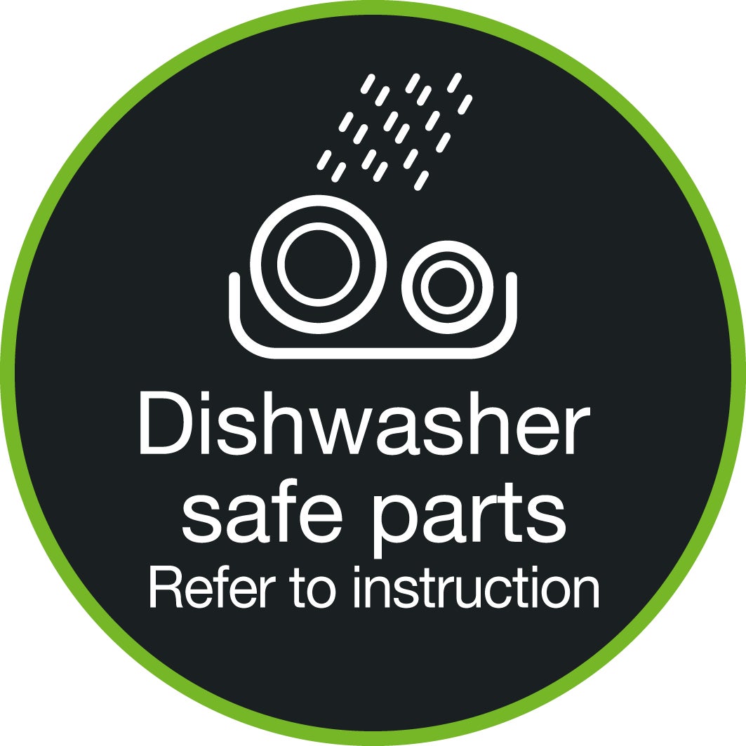 専用計量カップに洗剤とぬるま湯を入れて10~20秒スイッチを入れるだけで、容器と刃の周りのお手入れ可能。本体を含むー部を除き食器洗い機でも洗えます。
