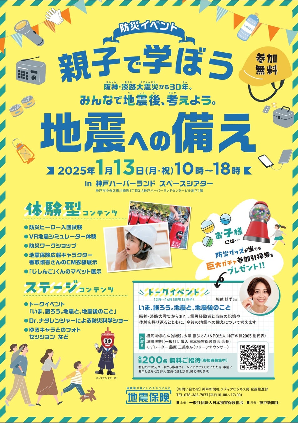 阪神・淡路大震災発生から30年となる機会をとらえ、一般社団法人日本損害保険協会と神戸新聞社は、地震への備えの必要性を学べる防災イベント「親子で学ぼう、地震への備え ~阪神・淡路大震災から30 年。みんなで地震後、考えよう~ 」を開催します。