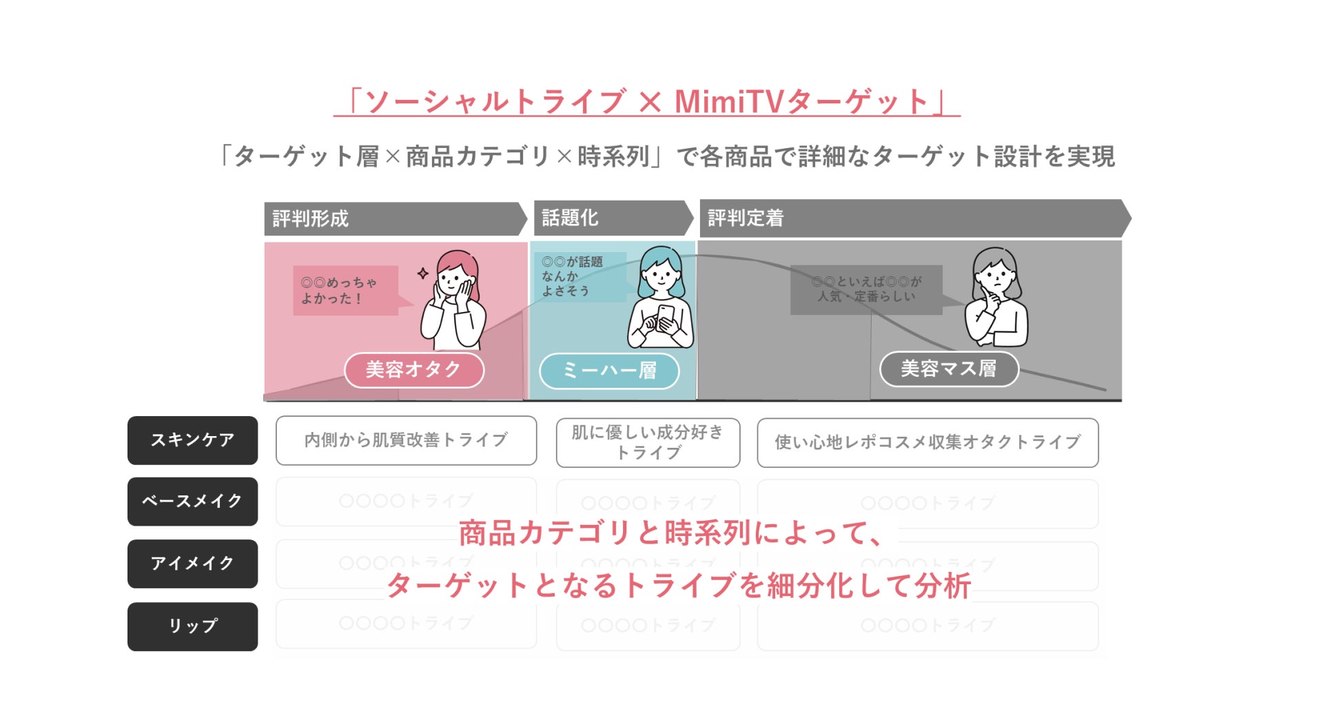 このような背景を踏まえ当社は、SNS総フォロワー数577万の美容メディア「MimiTV」を運営するトレンダーズ株式会社と業務提携をすることにより、当社が持つソーシャルリスニングによるソーシャルトライブ(※)分析のノウハウと、「MimiTV」のフォロワーデータを掛け合わせることで、美容領域に特化したソーシャルトライブマーケティングサービスを共同開発いたしました。